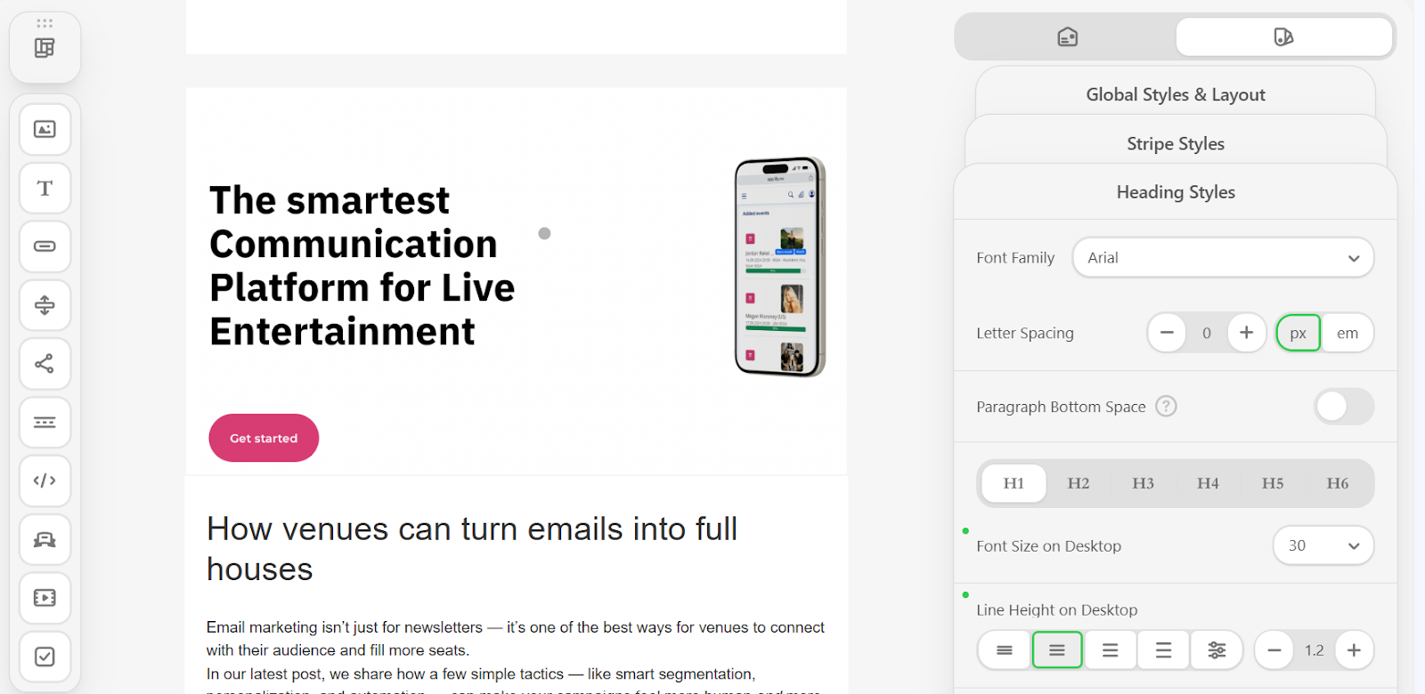 To create breathing room between sections, drag a spacer block into your layout. You can adjust its height, width and color in the right-hand editor panel.
